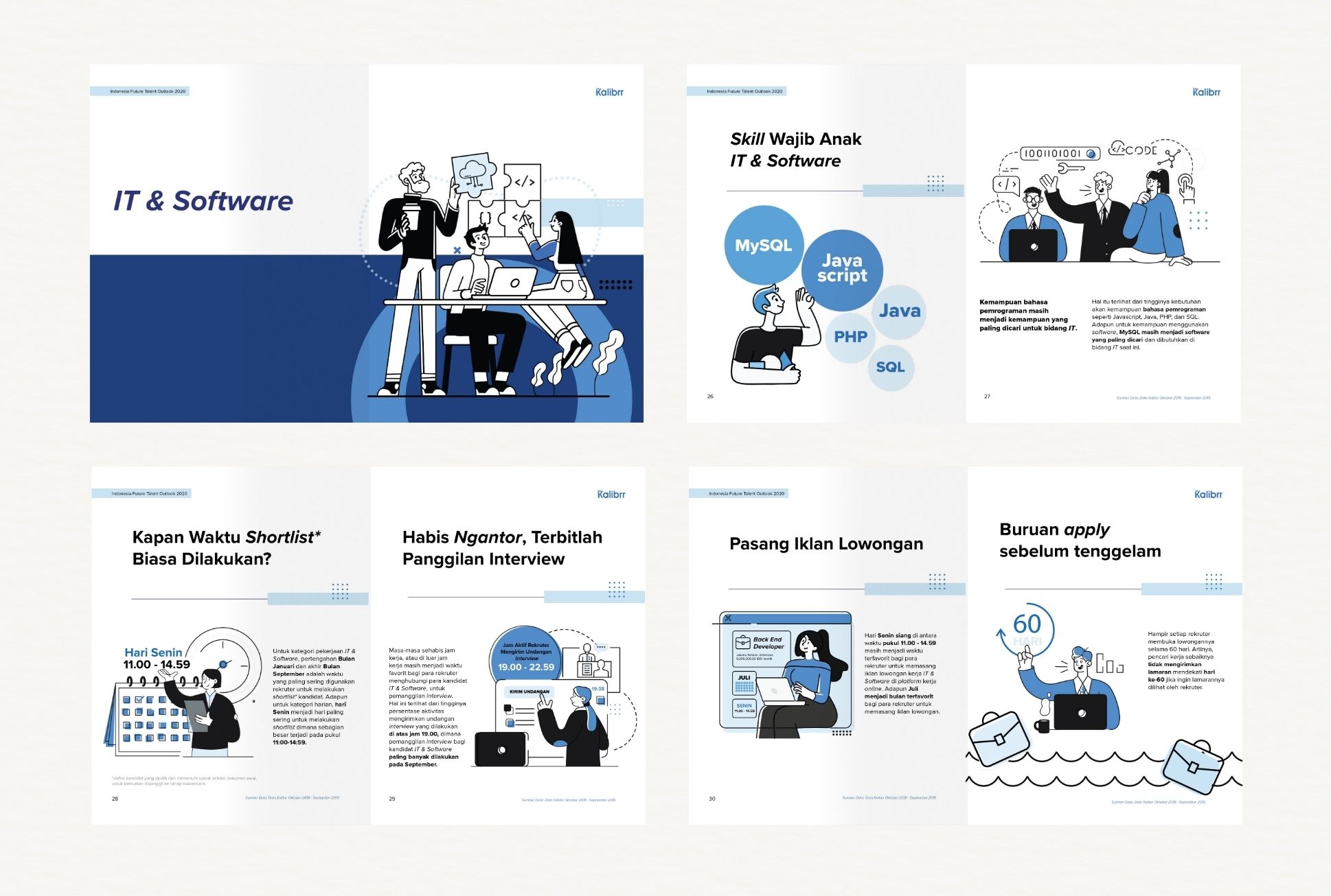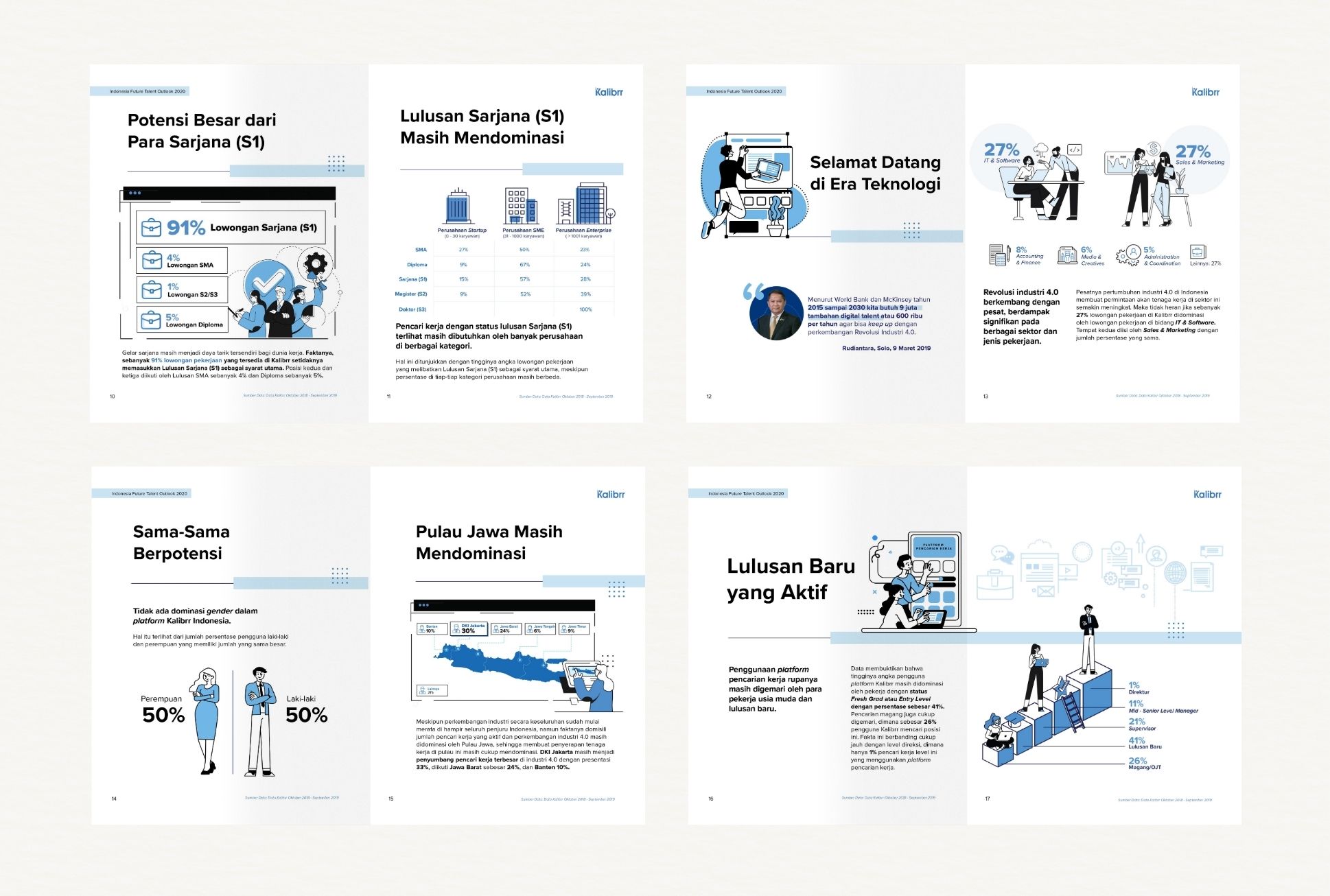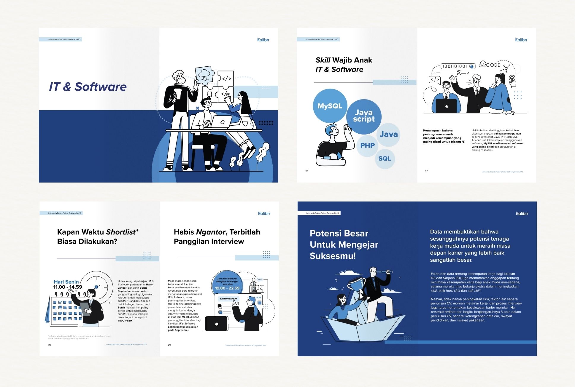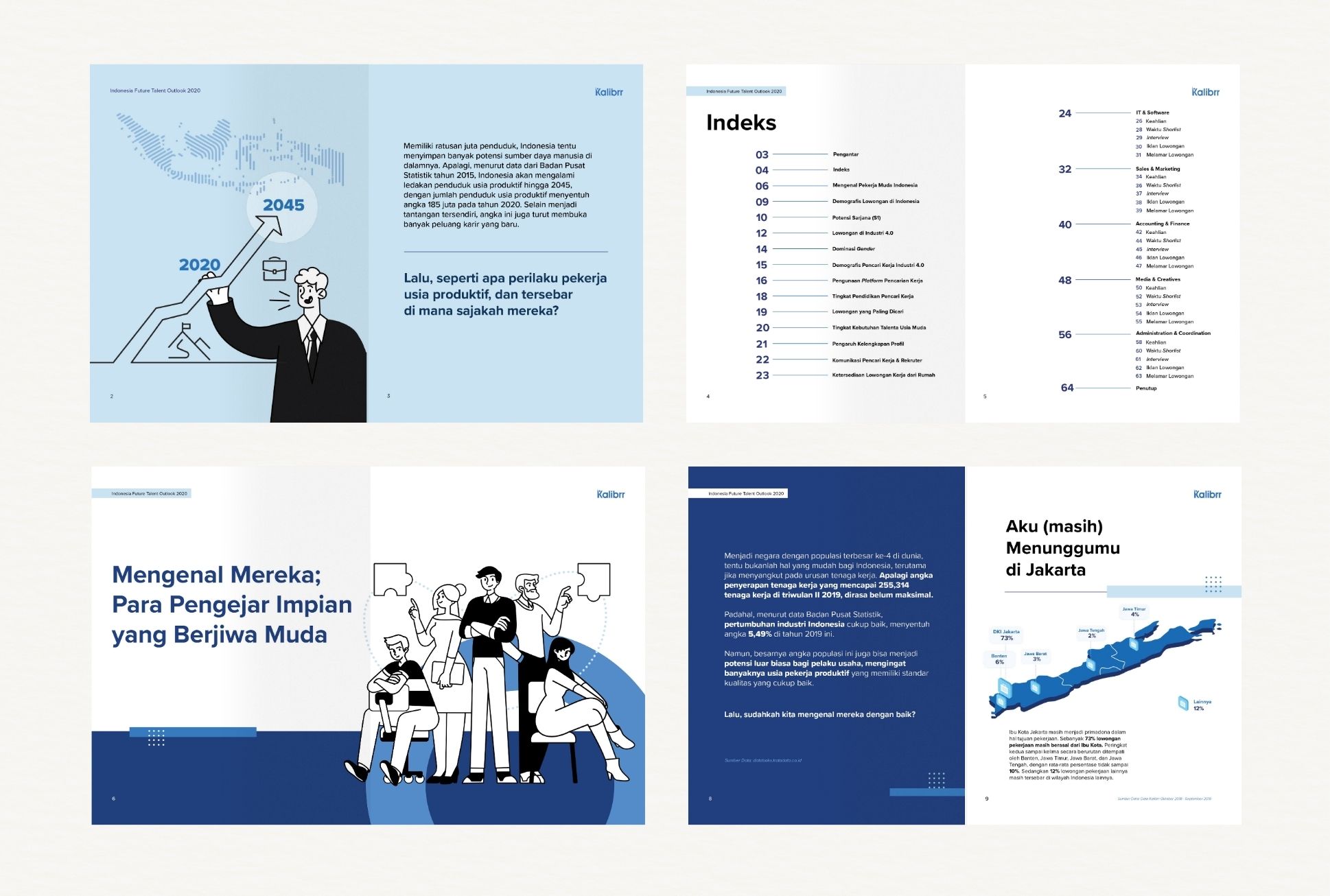 Indonesia Future Talent Outlook 2020 by Kalibrr visual concept combines geometric patterns with illustrative storytelling to reflect the evolving workforce in the digital era. The cohesive blue color scheme enhances clarity and credibility, aligning with Kalibrr’s brand while emphasizing a data-driven, insightful publication.